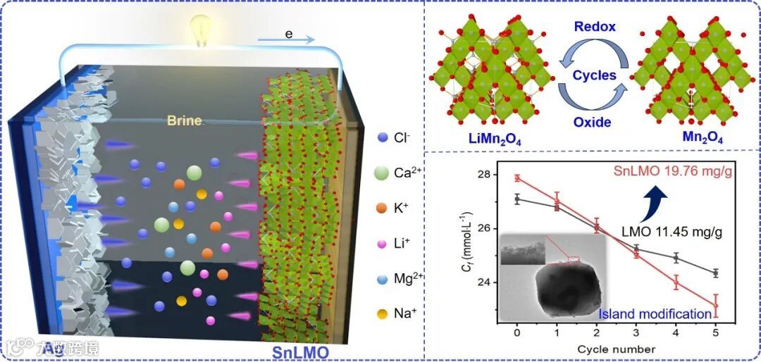 电化学法是从盐湖卤水中提锂的主要方法之一。尖晶石型锰酸锂(LiMn2O4,LMO)具有特定的锂空位和合适的电位窗口,从而具有优异的Li+选择性,被广泛用作选择性捕获Li+的电极材料。然而,LMO固有的Jahn-Teller效应决定了其较差的循环稳定性,且实际提锂容量与理论容量之间存在差距,限制了其在电化学中的应用。
