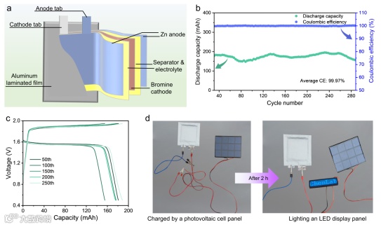 图6. Zn||Br2 软包电池的电化学性能。(a) Zn||Br2软包电池的结构。(b) Zn||Br2 软包电池的循环性能。(c) Zn||Br2 软包电池工作的恒流充放电曲线。(d) Zn||Br2 软包电池的储能展示。