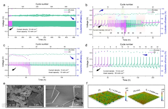 为了进一步探究HAA对锌负极可逆性的影响,我们组装了Zn||Cu半电池。Zn||Cu半电池在10 mA cm-2/10 mAh cm-2条件下可稳定运行930 h,并可以在10 mA cm-2/50 mAh cm-2的苛刻条件下运行200 h以上。采用SEM和LSCM对锌负极的形貌进行了表征,进一步验证了具有烯醇互变平衡的添加剂的优越性。