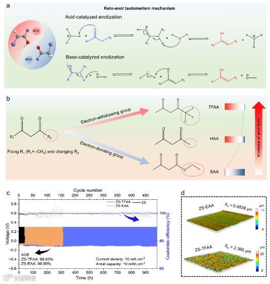 图1. 酮-烯醇互变异构的机理和添加剂的初步优化。a) 酮-烯醇互变异构的机制。(b) β-二羰基有机物的调节。(c) Zn||Cu 半电池在 ZS, ZS-TFAA 和 ZS-EAA 中的电化学性能。(d) 在ZS-TFAA 和 ZS-EAA中锌沉积层的 LSCM 图像。