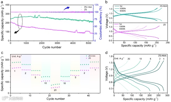 Zn||V2O5全电池以验证 HAA 在实际应用中的可行性。在5 A g-1 的循环条件下,Zn||V2O5的理论容量高达 272.6 mAh g-1,可稳定工作5000 圈以上,平均库伦效率高达 99.95%。相比之下,没有 HAA 的电池仅显示出 210.9 mAh g-1 的最高比容量,并且其容量在循环过程中急剧衰减。比容量在不到 600 次循环后降低至 168.7 mA h g-1。这些数据表明,HAA 可以有效提升Zn||V2O5全电池的循环稳定性。此外,全电池的倍率性能比较也支持上述结论。