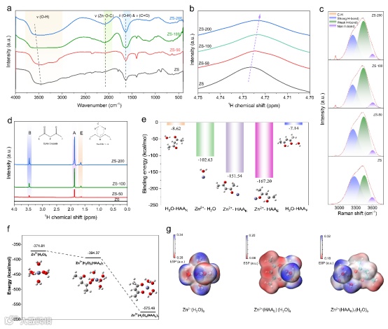 图2. 添加剂HAA 对电解质性能的影响。(a) 电解液ZS、ZS-50、ZS-100 和 ZS-200 的 FT-IR 光谱。(b) ZS、ZS-50、ZS-100 和 ZS-200 的 NMR (4.7 to 4.75 ppm)。(c) C-H和 O-H 伸缩振动峰的拟合。(d) ZS、ZS-50、ZS-100 和 ZS-200 的 NMR (0 - 4 ppm)。 (e) H2O-HAAE, H2O-HAAk, Zn2+-H2O Zn2+-HAAE 和Zn2+-HAAK的结合能。(f) Zn2+(H2O)6, Zn2+(H2O)4HAAE 和Zn2+(H2O)5HAAK的溶剂化能。(g) Zn2+(H2O)4HAAE, Zn2+(H2O)5HAAK 和 Zn2+(H2O)6的静电势映射。