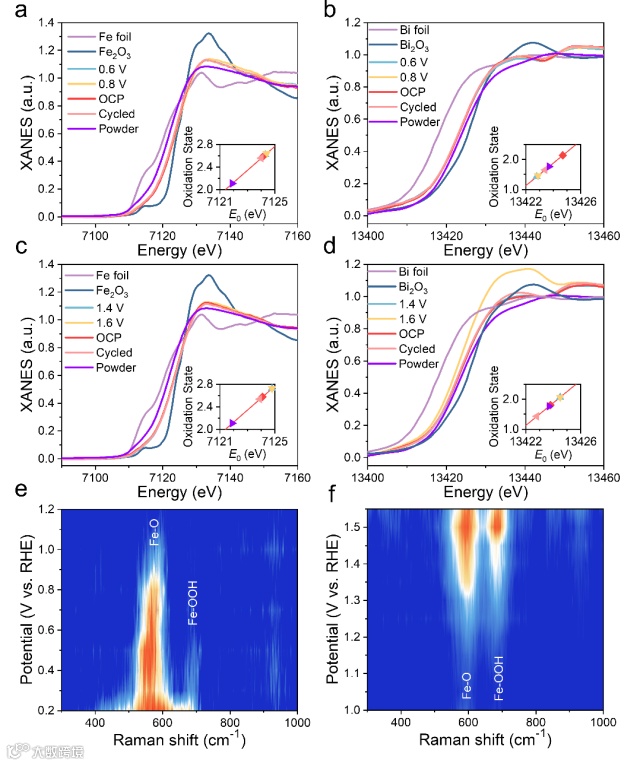 图4. Fe₂BiN₅/C的ORR与OER反应的原位XAFS与拉曼谱。