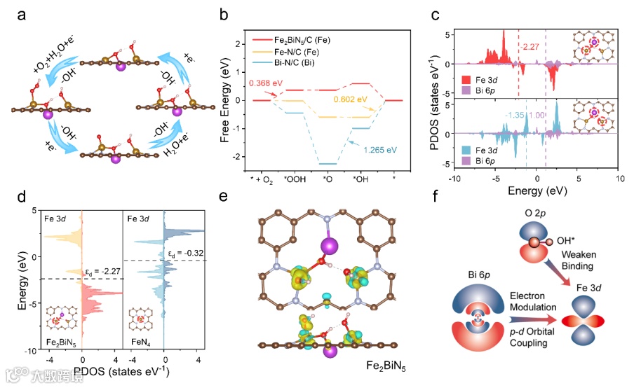 电子密度泛函理论(DFT)计算得到Fe₂BiN₅的能量势垒最低,投影态密度(PDOS)显示Fe与Bi轨道重叠,电子相互作用强。。另外,邻近的Bi原子配位作用导致Fe₂BiN₅中Fe的d带中心相比FeN₄发生下移,远离费米能级,增加*OH的吸附难度。同样的,Fe₂BiN₅吸附*OH的差分电荷图中,Fe和*OH之间的电子耗尽区域相比FeN₄更为广泛,这促进*OH的脱附,优化FeN₄结构的*OH脱附反应决速步。综上,由Bi引发的p-d轨道耦合效应会降低Fe的d带中心、削弱*OH的结合能,并减少氧电催化的能垒。