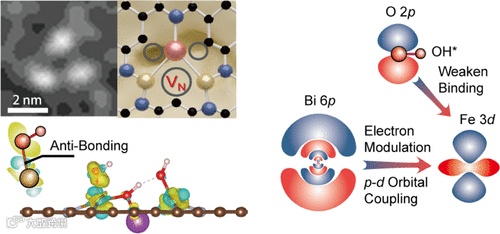 图2. 原子级分散的FeN₂−BiN−FeN₂位点调控p-d轨道耦合与富空位缺陷结构示意图。