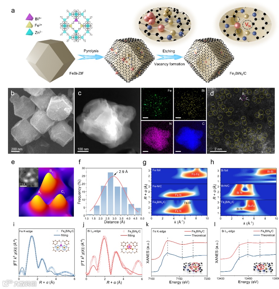 本文提出一种新颖的三原子Fe₂BiN₅/C催化剂设计策略,由XPS与拉曼谱确认其碳框架载体富含氮空位,像差校正高角度环形暗场透射电子显微镜图像(AC-HAADF-STEM)和XAFS拟合确认原子级分散的FeN₂−BiN−FeN₂位点结构,并用有限差分法计算XANES理论曲线进一步证实。