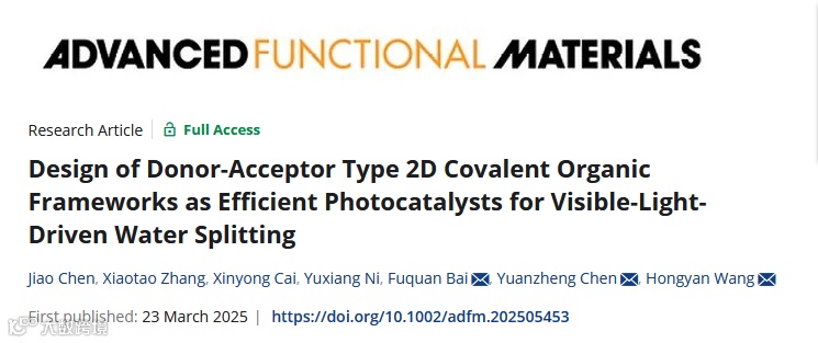 Design of Donor-Acceptor Type 2D Covalent Organic Frameworks as Efficient Photocatalysts for Visible-Light-Driven Water Splitting,Adv. Funct. Mater. 2025, 2505453