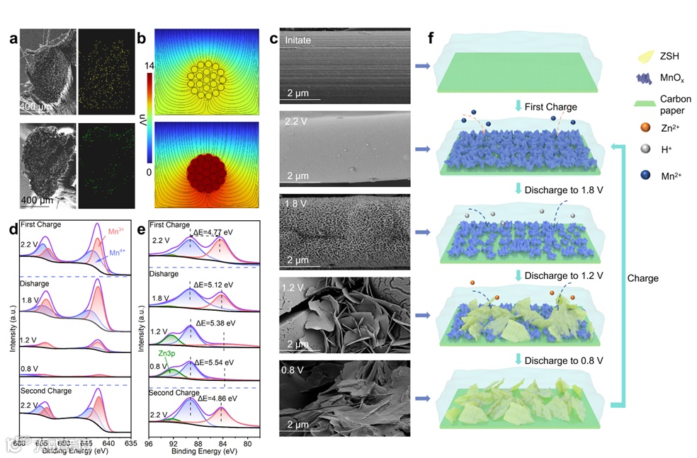 Figure 3. Deposition and dissolution of active species on carbon wire cathode. (a) SEM images (left) and Mn mappings (right) of the cross section of carbon wire cathode prepared by constant voltage charging (top) and traditional coating (bottom). (b) Finite element simulation in potential for the carbon wire cathode prepared by constant voltage charging (top) and traditional coating (bottom). (c) SEM images of the carbon wire cathode at different charge and discharge voltages. (d-e) XPS spectra of Mn2p (d) and Mn3s (e) in cathode at different voltages. (f) Schematic illustration of charge/discharge mechanism on carbon wire cathode.