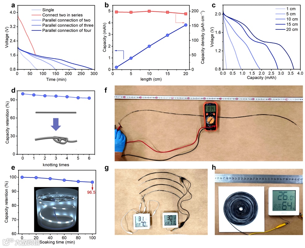 Figure 5. Adaptability and scalability of fiber batteries. (a) Discharge curves of the fiber batteries under series and parallel conditions. (b) Capacity of the fiber batteries with different lengths. (c) Discharge curves of the fiber batteries with different lengths. (d) Capacity retention of the knotted fiber battery. (e) Capacity retention of the fiber battery immersed in water. (f,g) Photograph of the fiber battery before (f) and after (g) shearing. (h) Photograph of the fiber battery with a length of 5 meters.