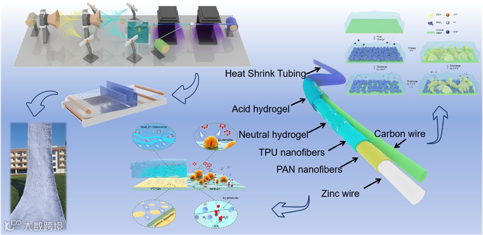 新兴柔性电子的快速发展正在引领如可穿戴设备、电子皮肤、智能纺织品的快速发展。为了支持这些电子设备的发展,迫切需要具有良好电化学性能以及柔韧性的储能器件。由于重量轻、体积小、柔韧性和可缝合性的进步,纤维状电池引起了学术界和工业界的高度关注,并且随着高安全性锌锰(Zn-Mn)纤维电池的发展,有望取得重大进展。然而,目前报道的纤维电池制备工艺都有着严格的要求,活性物质难以快速连续在电极纤维上均匀涂覆;锌负极固有的枝晶生长以及吸氢反应在纤维电池中更加猖獗,同时较低的电化学窗口限制了纤维锌离子电池的发展。