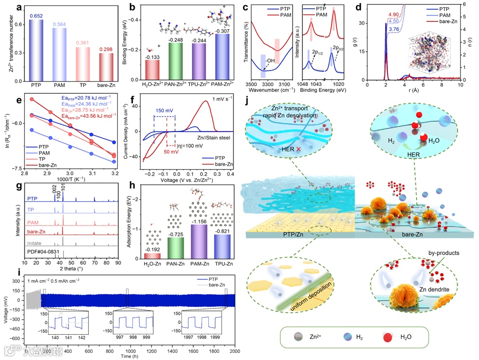 Fig.2 The influence of PTP on Zn anode. (a) Zn2+ transference numbers in different electrolytes. (b) Binding energies of Zn2+ ions with H2O, PAN, TPU, PAM molecules. (c) FTIR spectra (left) and the Zn2p XPS spectra (right). (d) RDF of Zn-O (H2O) and the radius-dependent coordination numbers. (Inset is the image of PTP system obtained by molecular dynamics). (e) Arrhenius activation energy. (f) CV curves of Zn//stainless steel batteries with different electrolytes at a scanning rate of 1 mV s−1. (g) XRD patterns of the Zn anodes with different systems after 50 cycles at 1 mA cm−2 and 1 mAh cm−3. (h) Adsorption energies of H2O, PAN, TPU, PAM molecules on Zn anode. (i) Cycling performance of Zn//Zn symmetric button batteries containing different electrolytes. (j) Schematic illustration of the mechanism of PTP composite hydrogel electrolyte in inhibiting HER, accelerating Zn2+ transport, and inducing uniform deposition of Zn2+.