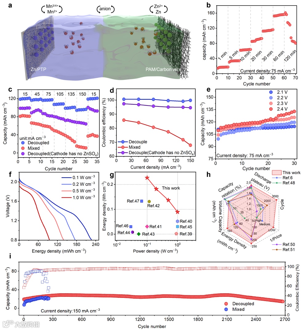 Figure 4. Electrochemical performance of fiber batteries. (a) Schematic illustration of the battery structure with the decoupled hydrogel electrolyte. (b) Cycling performance with different charging time. (c) Rate performance. (d) Coulombic efficiency at different current densities. (e) Cycling performance at different charge voltages. (f) Voltage-energy density curves at different power densities. (g) Ragone plots of the devices in this work compared with recently reported batteries. (h) Comparison of electrochemical performances with previously reported zinc-ion fiber batteries. (i) Long cycle performance of the fiber batteries with decoupled and mixed electrolytes at a charge voltage of 2.2 V for 5 min and a discharge current density of 150 mA cm−3.
