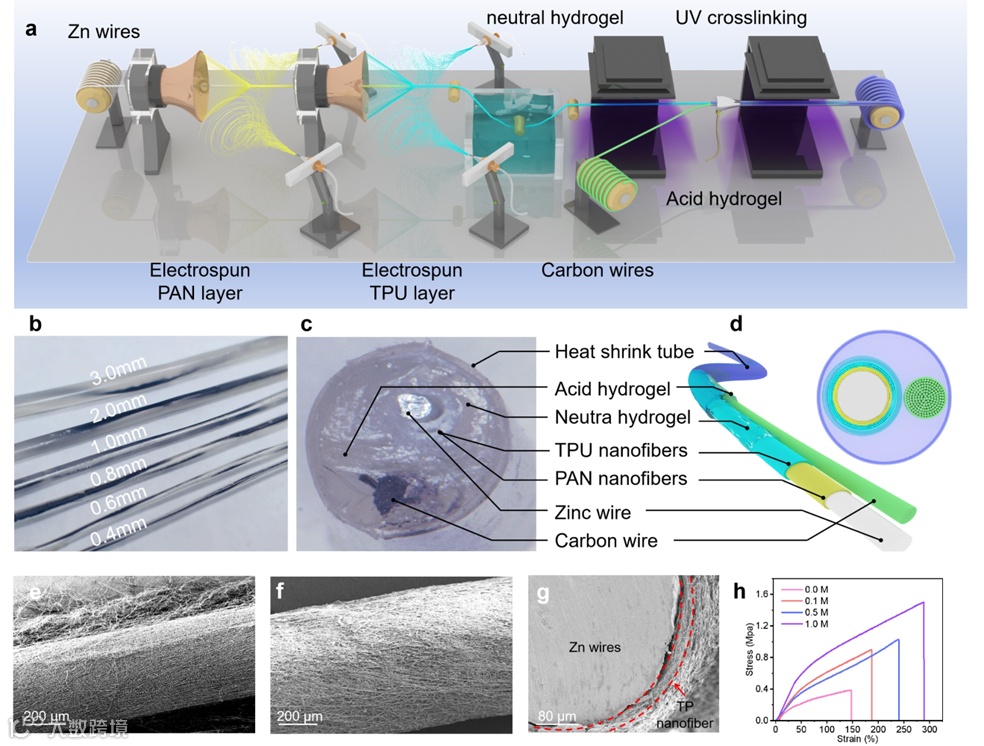 Fig.1 Preparation of Zn-Mn fiber batteries. (a) Schematic illustration of the preparation procedure. (b,c) photograph of the fiber batteries with different diameters (b) and the cross-section view (c). (d) Structure illustration of the fiber batteries (inset: cross-section). (e-g) SEM images of the Zn wires coated by PAN (e) and TPU/PAN (f-g) at different preparation stages. (g) is the cross-section of (f). (h) Stress-strain curves of PAM hydrogel with different concentrations of MnSO4.