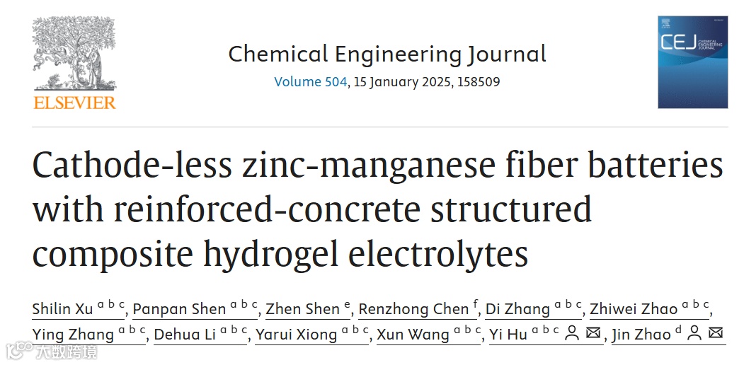 鉴于此,浙江理工大学纺织科学与工程学院(国际丝绸学院)博士生导师胡毅教授课题组以及南京邮电大学赵进教授课题组报道了一种无阴极结构的纤维锌离子电池,该电池消除了在制备过程中繁琐的涂覆活性物质工艺,在正极仅导电集流体,通过恒压充电工艺将电解质中的锰离子沉积到集流体表面以负载活性物质;利用具有“钢筋混凝土”结构的纳米纤维基复合凝胶电解质优化了与Zn2+离子的相互作用,加速了Zn2+离子的输运,抑制了HER和Zn枝晶的生长。通过质子插入与碱式硫酸锌的辅助沉积/溶解作用,有效电池的电压窗口和容量,相关工作以“Cathode-less zinc-manganese fiber batteries with reinforced-concrete structured composite hydrogel electrolytes”为题发表在国际著名期刊Chemical Engineering Journals上(影响因子13.3),doi:10.1016/j.cej.2024.158509。