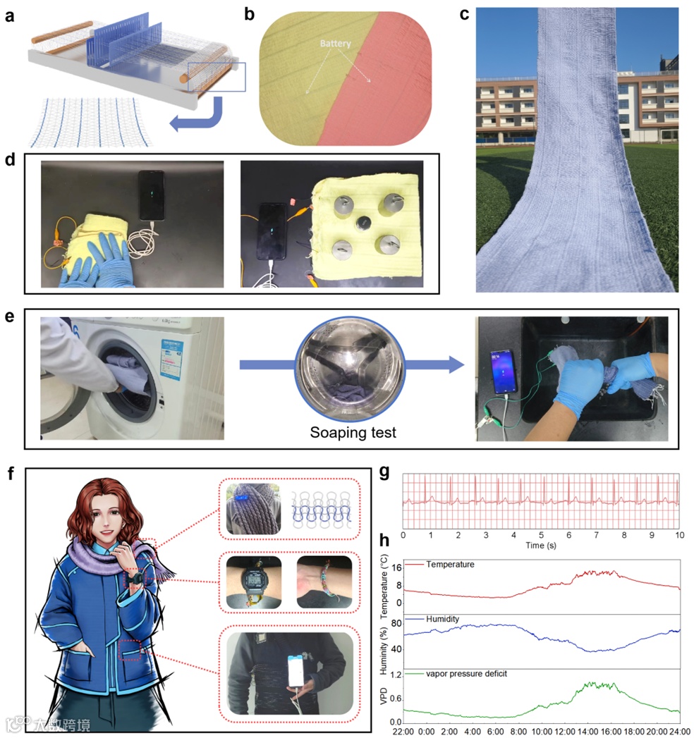 Figure 6. Production and practical application of fabric battery. (a) Schematic illustration of commercial weaving loom. (b) Photograph of the position of fiber batteries in textiles. (c) Photograph of a large-scale fabric battery with spanning 3 meters in length and 0.5 meters in width. (d) Photograph of the fabric batteries powering a mobile phone under folding and heavy pressuring. (e) Soaping test in soapy water with a washing machine and powering a mobile phone after washing. (f) Demonstration of practical application of the fabric battery. (g) Electrocardiography monitored and drawn using the HTS sensor in (f) with a running speed of 25 mm s−1 and a transmission gain of 10 mV mm−1. (h) Environmental data, including temperature, humidity, and vapor pressure deficit, recorded by the HTS sensors in (f) and transmitted to the mobile app by Bluetooth.