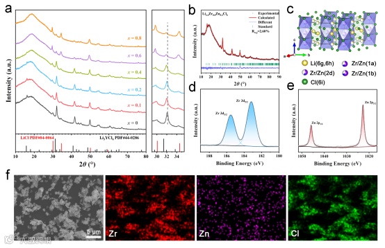 图1. a) 所制备Li2+2xZr1-xZnxCl6样品的X射线衍射图谱。b) Li2+2xZr1-xZnxCl6 (x=0.2) 的XRD图谱及对应Rietveld精修结果。c) Li2+2xZr1-xZnxCl6 (x=0.2) 的晶体结构示意图。d) Li2+2xZr1-xZnxCl6 (x=0.2) 的Zr 3d及e) Zn 2p XPS谱图。f) 制备的Li2+2xZr1-xZnxCl6 (x=0.2) 的SEM图像及对应EDS元素分布。