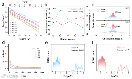 图2. a) Li2+2xZr1-xZnxCl6固态电解质的阿伦尼乌斯曲线。b) 30°C下离子电导率及活化能随Zn2+掺杂量(x)的变化趋势。c) LZC与LZZC的⁷Li SSNMR谱。d) Li2+2xZr1-xZnxCl6电解质的直流极化曲线。e) LZC与f) LZZC电解质的计算部分态密度(PDOS)分布。