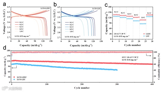 图5. 使用LZZC固态电解质与LCO正极匹配组装的全固态锂离子电池的电化学性能。
