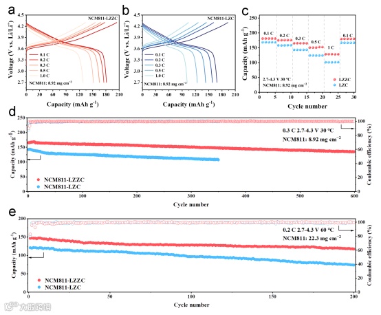 图6. 使用LZZC固态电解质与NCM811正极匹配组装的全固态锂离子电池的电化学性能。