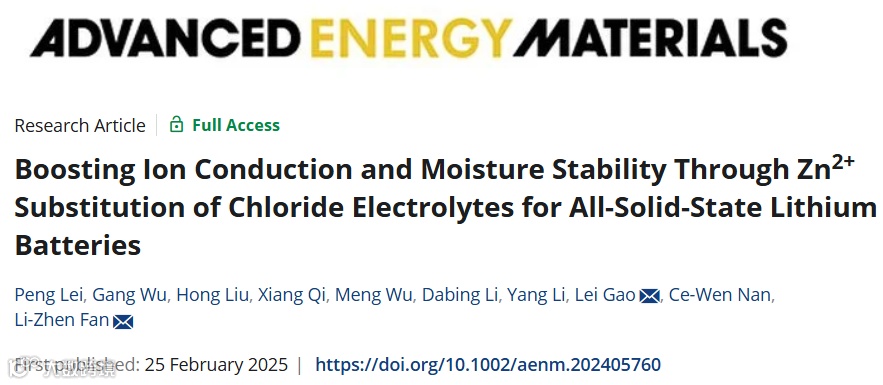 基于此,来自北京科技大学的范丽珍教授与高磊教授合作,在国际知名期刊Advanced Energy Materials上发表题为“Boosting Ion Conduction and Moisture Stability Through Zn2+ Substitution of Chloride Electrolytes for All-Solid-State Lithium Batteries”的文章。本文提出了一种软酸性Zn2+掺杂策略,成功制备了兼具高离子电导率与优异湿度稳定性的锆基氯化物固态电解质。具体而言,Zn2+取代扩大了各向异性晶格体积,并将额外的Li+移动电荷载流子引入晶格,促进了Li+在微晶结构内的迁移。