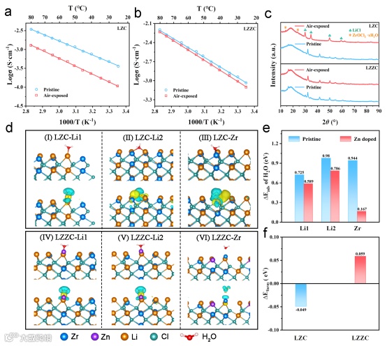 图4. a) LZC与b) LZZC电解质在潮湿空气暴露前后的阿伦尼乌斯曲线对比。c) 潮湿空气暴露前后LZC与LZZC电解质的XRD图谱演变。d) H2O分子在LZC与LZZC(001)晶面的吸附构型(上)及其诱导的差分电荷密度分布(下),其中电子富集与耗尽区域分别以黄色和青色标示。e) H2O在LZC与LZZC(001)面不同位点的吸附能。f) 氧原子掺杂至LZC与LZZC(001)面的形成能。