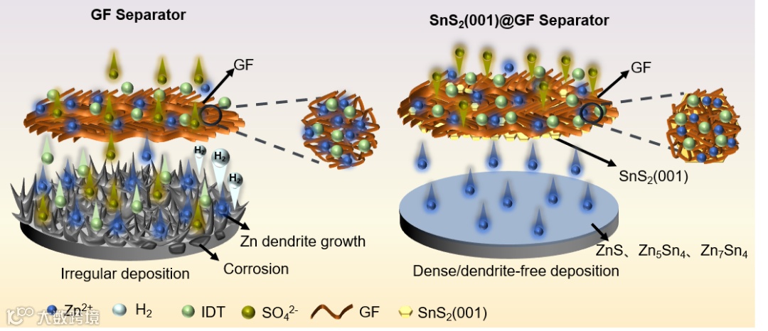 图1. SnS2(001)@GF多功能隔膜在Zn||IDT电池中的示意图。