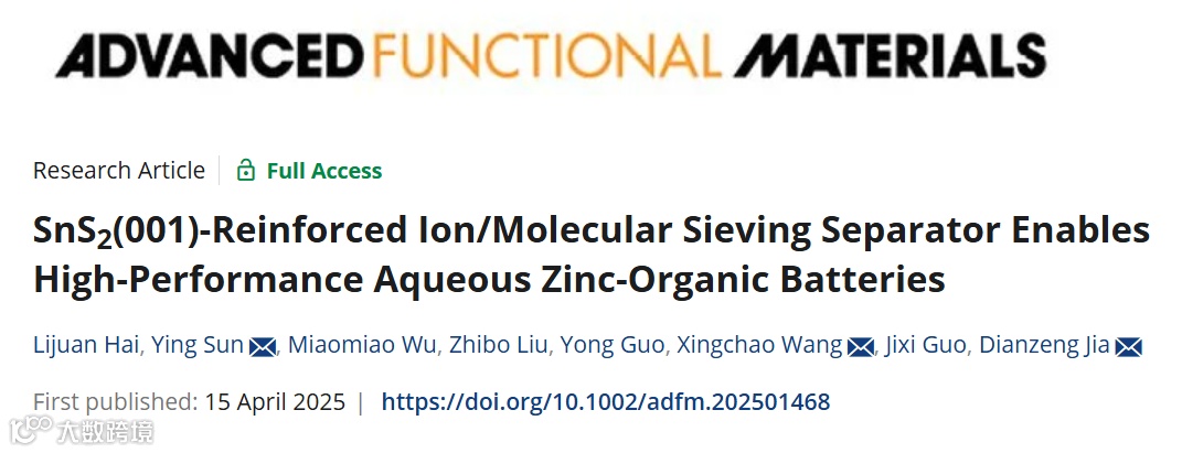 基于此,来自新疆大学的贾殿赠教授与王省超教授合作,在国际知名期刊Advanced Functional Materials上发表题为“SnS2(001)-Reinforced Ion/Molecular Sieving Separator Enables High-Performance Aqueous Zinc-organic Batteries”的文章。该文章详细分析了SnS2(001)@GF隔膜增强分子/离子的筛分作用机制,同时提高了水系锌有机电池负极和正极界面的稳定性,为实现高性能锌有机电池提供了思路。