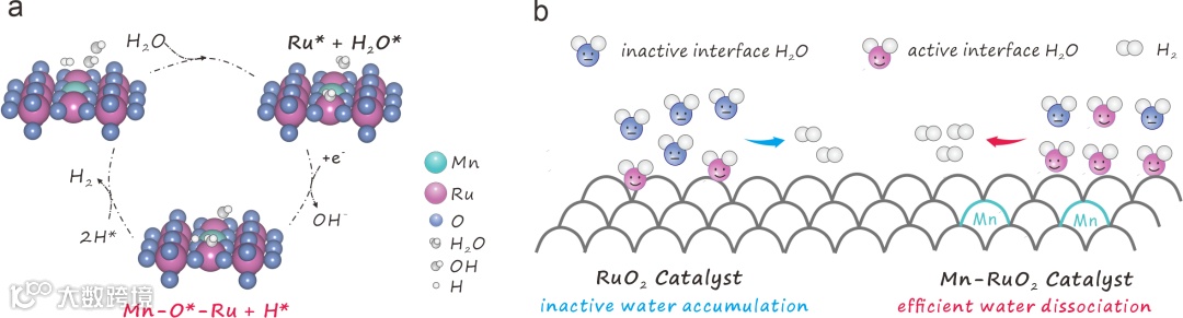 图1. Mn-RuO2电催化剂的HER机理图和水分解示意图。