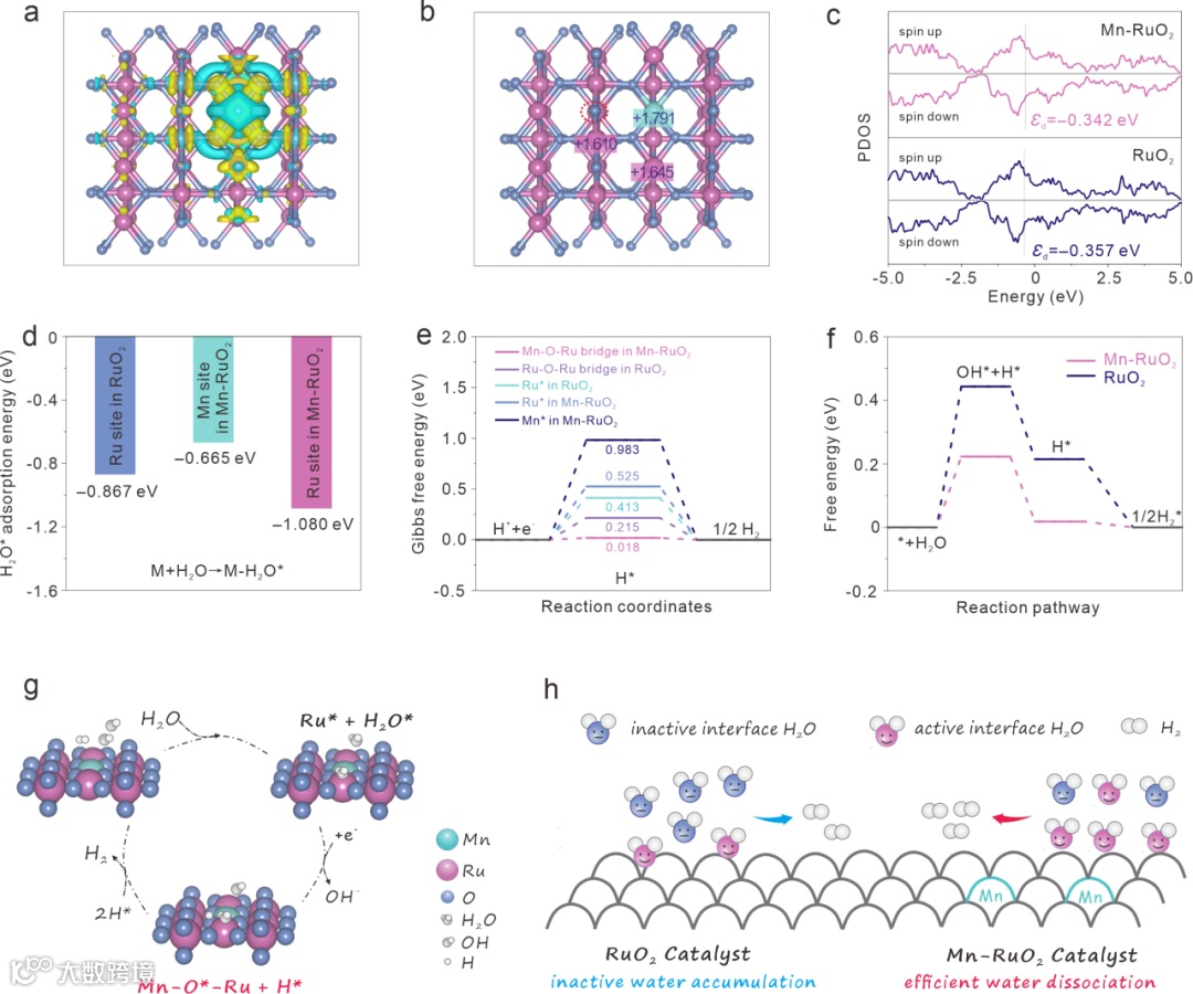 图2. DFT计算。(a) Mn-RuO2模型上电荷密度差的俯视图,青色和黄色区域分别代表电子耗尽区和电子积累区。(b) Mn-RuO2模型上Mn(绿色)和Ru(粉色)位点的Bader电荷分析。(c) Mn-RuO2和RuO2模型上Ru位点的DOS光谱和d带中心。(d) Mn-RuO2和RuO2不同位点的H2O*吸附能值。(e) Mn-RuO2和RuO2不同位点吸附H*的吉布斯自由能图。(f) Mn-RuO2和RuO2上H2O解离和H*吸附自由能的比较。