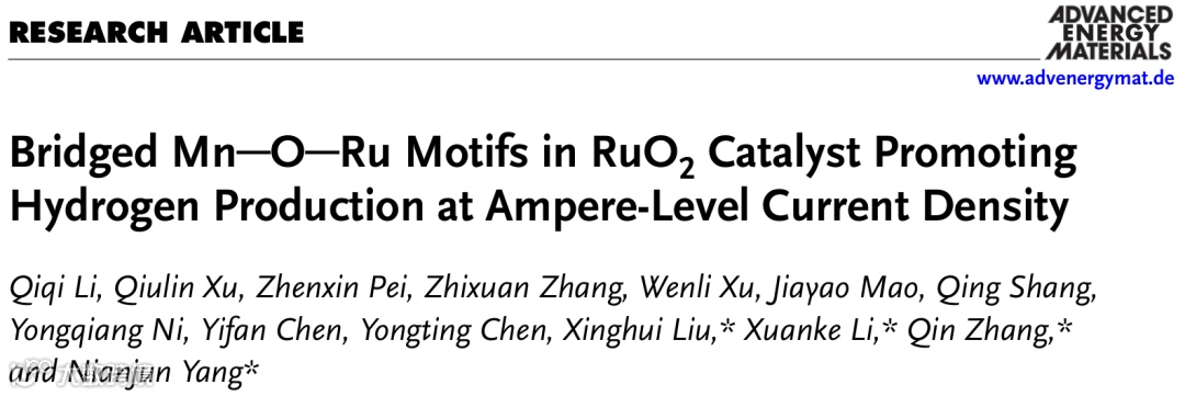 基于此,武汉科技大学李轩科教授、张琴教授和比利时哈瑟尔特大学杨年俊教授、湖北航空航天化学技术研究所刘性辉教授合作,在国际知名期刊Advanced Energy Materials上发表题为“Bridged Mn-O-Ru Motifs in RuO2 Catalyst Promoting Hydrogen Production at Ampere-level Current Density”的论文,通过Mn原子掺杂,将Mn-O-Ru桥氧结构引入RuO2电催化剂,精确调控优化各活性位点,加速HER动力学过程,显著提升其碱性HER活性。