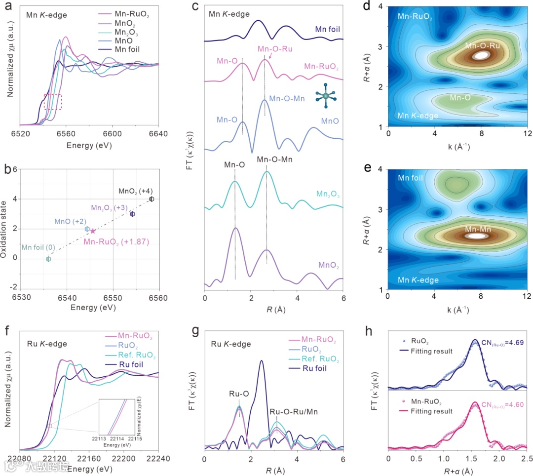 图4. Mn-RuO2和RuO2催化剂的精细结构表征。(a) Mn-RuO2催化剂、Mn箔、MnO以及Mn2O3和MnO2参考物的Mn K边XANES光谱。(b)根据Mn K边XANES光谱拟合出Mn-RuO2电催化剂中Mn的平均氧化态。(c) Mn-RuO2催化剂、Mn箔、MnO以及Mn2O3和MnO2标样在Mn K边的EXAFS光谱。(d) Mn-RuO2和(e) RuO2的Mn K边WT-EXAFS光谱。Mn-RuO2、自制RuO2、RuO2标样和Ru箔的Ru K边XANES(f)和EXAFS(g)光谱。(h) RuO2和Mn-RuO2催化剂在R空间的相应EXAFS拟合曲线。