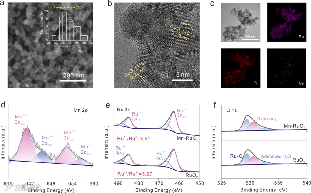 图3. Mn-RuO2和RuO2催化剂的物相表征。(a) Mn-RuO2催化剂的扫描电镜图像。(b) Mn-RuO2催化剂的高分辨率TEM图像。(c) Mn-RuO2催化剂中Ru、O、Mn元素分析。(d) Mn-RuO2的Mn 2p XPS光谱。(e) Mn-RuO2和RuO2催化剂的Ru 3p XPS 光谱。(f) Mn-RuO2和RuO2催化剂的O 1s XPS 光谱。