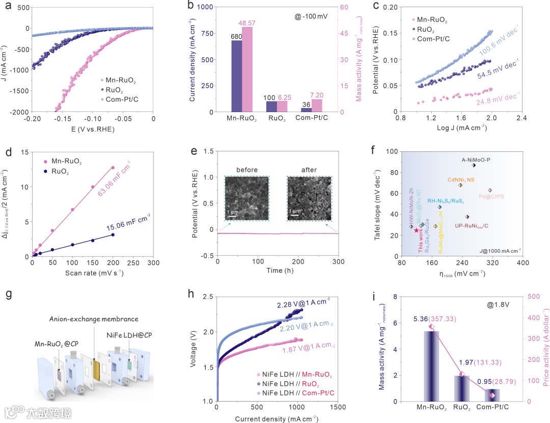 图5. Mn-RuO2的碱性HER性能测试。(a) 1 M KOH中的LSV曲线。(b) 过电位为–100 mV时的质量活性比较。(c) Mn-RuO2、自制RuO2和商用Pt/的塔菲尔图。(d) Mn-RuO2和RuO2催化剂的Cdl值。(e) Mn-RuO2催化剂在10 mA cm-2电流密度下的稳定性测试,催化剂载体为玻碳电极。插图显示了Mn-RuO2电催化剂在稳定性测试前后的扫描电镜图。(f) 1.0 M KOH中,Mn-RuO2催化剂与之前报道的电催化剂在1 A cm-2 的过电位和Tafel斜率的比较。(g) 两电极电解水流动池示意图。(h) NiFe LDH // Mn-RuO2、NiFe LDH // RuO2和 NiFe LDH // 商用Pt/C 的iR校正极化曲线。