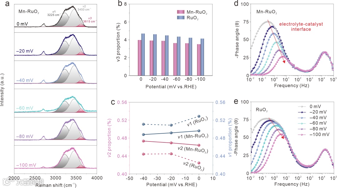 图6. Mn-RuO2电催化剂的碱性HER机理研究。(a) Mn-RuO2在1 M KOH溶液中不同施加电位下的原位Raman光谱。(b) Mn-RuO2和RuO2催化剂在≈3615 cm-1处的υ3峰比例。(c) 不同电位下Mn-RuO2和RuO2催化剂中υ1和υ2的峰面积比例。(d) Mn-RuO2和(e) RuO2在不同电压下的Bode图。