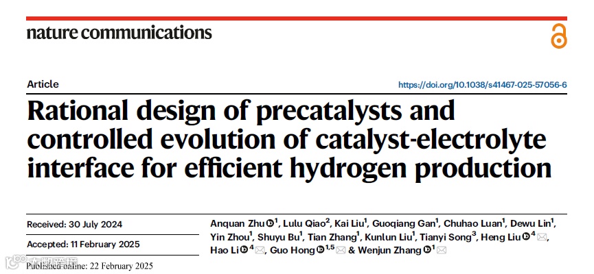 Anquan Zhu, Lulu Qiao, Kai Liu, Guoqiang Gan, Chuhao Luan, Dewu Lin, Yin Zhou, Shuyu Bu, Tian Zhang, Kunlun Liu, Tianyi Song, Heng Liu*, Hao Li*, Guo Hong*, Wenjun Zhang* Rational design of precatalysts and controlled evolution of catalyst-electrolyte interface for efficient hydrogen production. Nature Communications, 2025, 16, 1880.