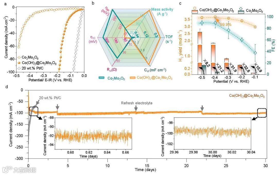 2、氢产率显著提高:Co(OH)2@Co2Mo3O8 的氢气产率比 Co2Mo3O8 高出十倍以上。在 -0.4 V,其法拉第效率为 99.9%,氢气产率达 1.85 mol h-1,是 Co2Mo3O8 的 21.2 倍。