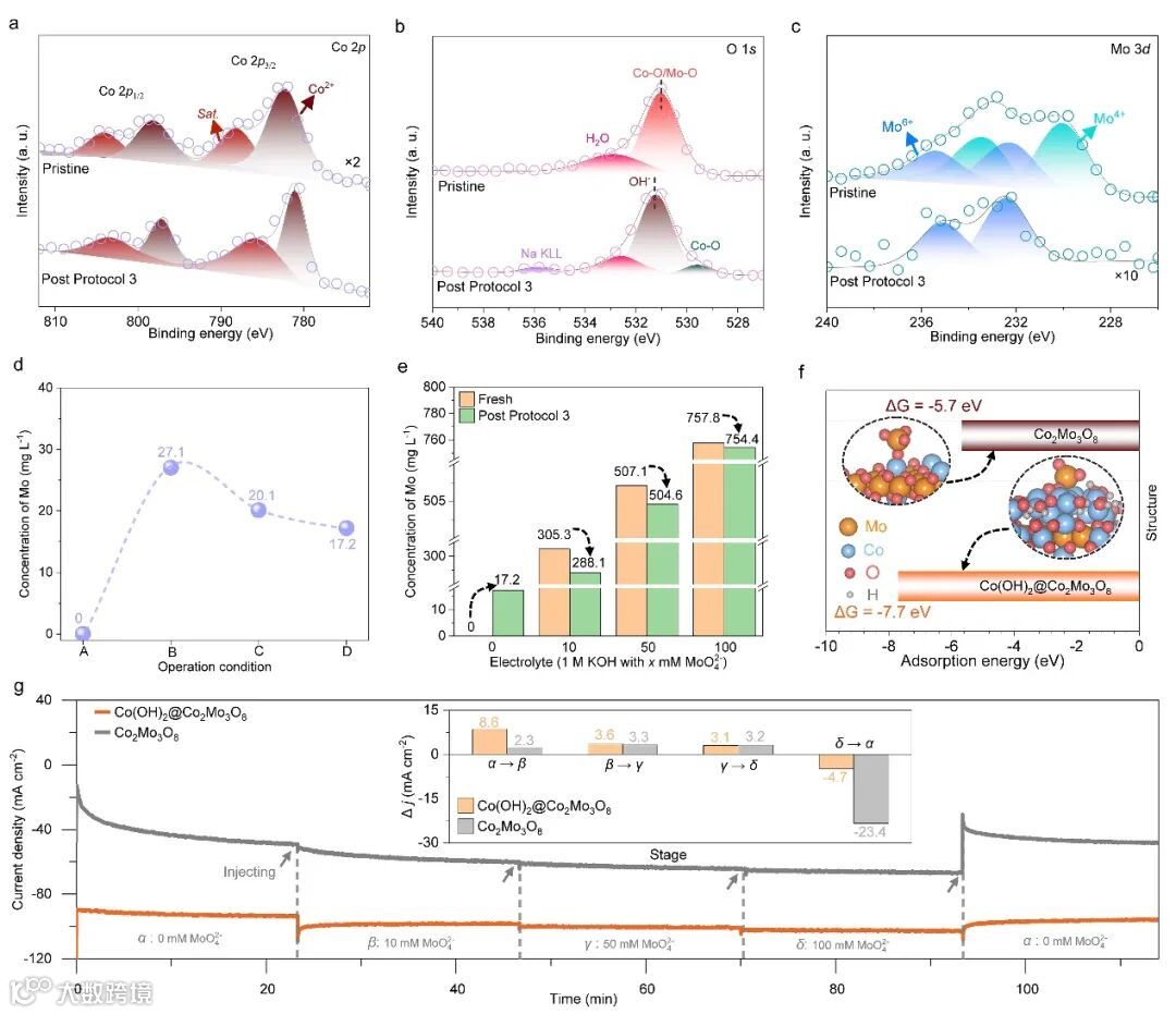 2、MoO42-的捕获能力:重构的Co(OH)2@Co2Mo3O8对MoO42-具有更强的捕获能力,其吸附自由能更低(-7.7 eV)。ICP-OES结果显示,MoO42-浓度在方案3处理过程中逐渐降低,表明催化剂对Mo物种的捕获。