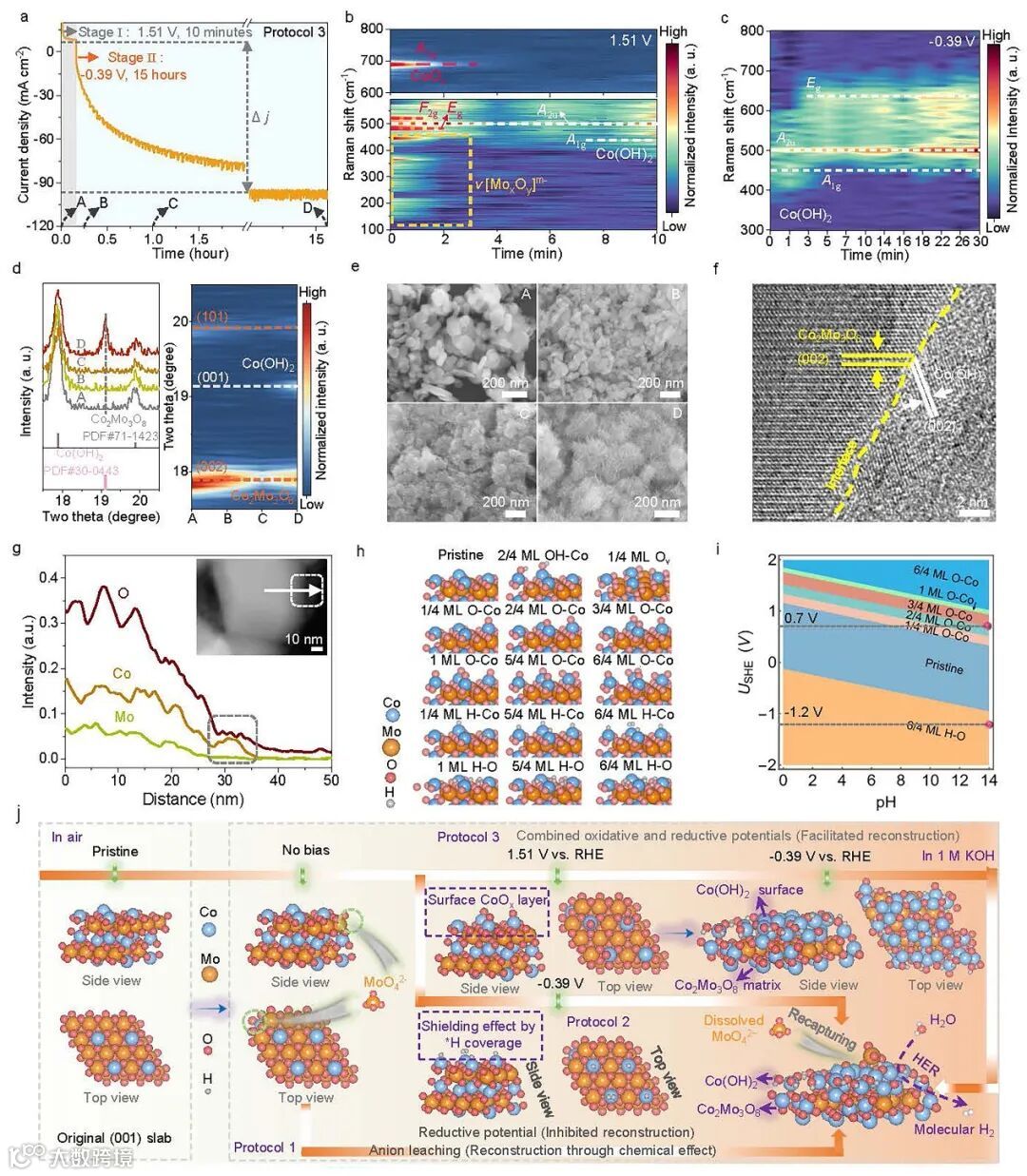 1、动态结构演变:通过三种不同的应用电压设置方案控制Co2Mo3O8预催化剂的动态结构演变,方案3形成的Co(OH)2@Co2Mo3O8催化剂表现出最高的产氢活性。电化学实验,原位拉曼光谱,非原位XRD图谱,SEM及TEM图片结果表明,在1.51 V氧化电势下,促进了Co2Mo3O8中的Mo蚀刻及CoOx暴露;随后在-0.39 V电势下,CoOx逐渐重构为Co(OH)2。