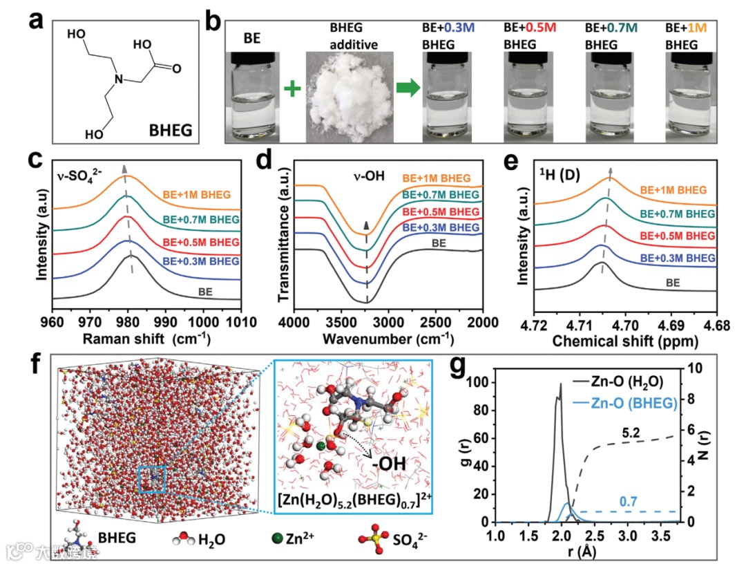 图1. (a) BHEG的分子结构。(b) BHEG添加剂及不同浓度电解液的光学照片. 不同电解液的 (c) 拉曼光谱, (d) 傅里叶变换红外光谱, (e) ¹H核磁共振谱图。(f) BE-BHEG电解液的分子动力学模拟和 (g) 对应的径向分布函数。