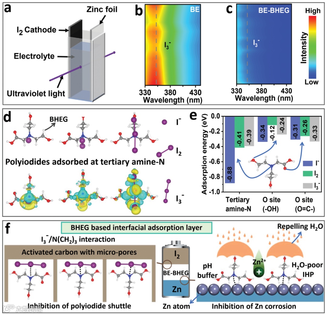 图7. (a) 原位紫外-可见吸收光谱测试装置示意图。(b,c) BE与BE-BHEG中I₃⁻的紫外吸收信号对比图,(d) BHEG叔胺-N基团与聚碘化物的吸附构型及电荷密度差分图。(e) 不同功能基团对聚碘化物的吸附能。(f) BHEG抑制聚碘化物穿梭与锌腐蚀的机制示意图。