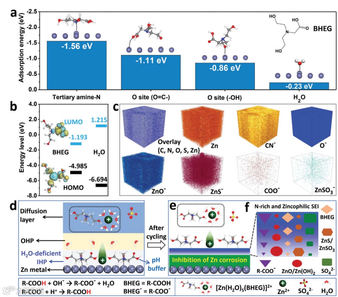 图5. (a) H₂O与BHEG分子在Zn(002)晶面的吸附能。(b) BHEG与H₂O的分子轨道(LUMO/HOMO),及BHEG的等值面图。(c) 循环后Zn负极的TOF-SIMS三维元素分布。(d) BHEG通过叔胺-N基团锚定Zn界面并构建“贫水”亥姆霍兹内层(IHP)的示意图。(e) BHEG诱导形成的富氮亲锌SEI层及 (f) 其成分分布。