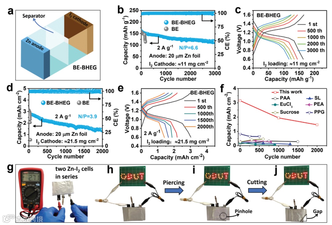 图6. (a) 基于BE-BHEG的Zn-I₂电池结构示意图。(b,d) 不同I₂载量下的循环性能及(c, e) 对应的充放电曲线。(f) 本研究与文献报道的锌碘电池性能对比。(g,h) 两个串联Zn-I₂软包电池点亮LED阵列的实物照片,及其 (i) 穿刺与 (j) 切割安全测试。