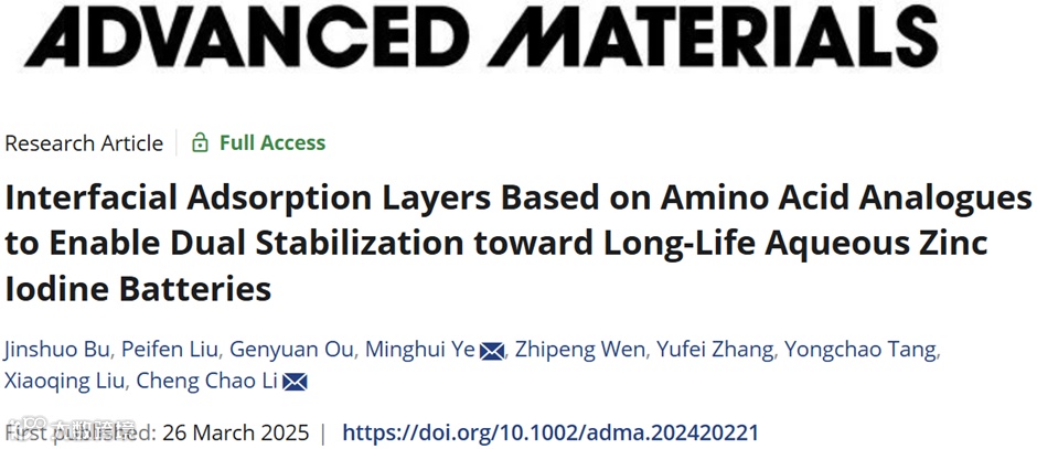 Interfacial Adsorption Layers Based on Amino Acid Analogues to Enable Dual Stabilization toward Long-Life Aqueous Zinc Iodine BatteriesJinshuo Bu, Peifen Liu, Genyuan Ou, Minghui Ye,* Zhipeng Wen, Yufei Zhang, Yongchao Tang, Xiaoqing Liu, Cheng Chao Li,* Adv. Mater., 2025,