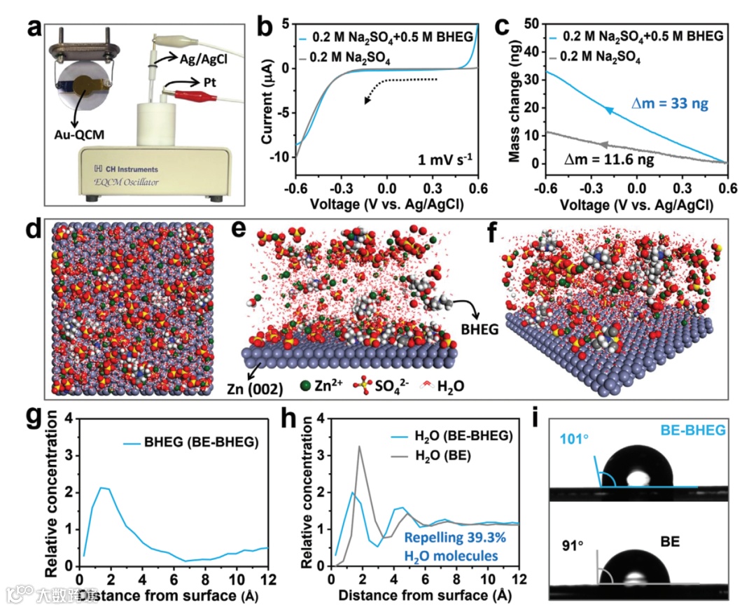 图2. (a) 集成三电极体系的电化学石英晶体微天平(EQCM)装置示意图,左上插图为Au-QCM电极. (b) 线性扫描伏安(LSV)曲线及对应的 (c) 质量变化数据. (d) BE-BHEG体系中Zn(002)晶面EDL结构的俯视图、(e) 前视图和(f) 斜视图. (g) BE-BHEG中BHEG分子在Zn(002)晶面的相对浓度分布, (h) BE与BE-BHEG中H₂O分子在Zn(002)晶面的相对浓度分布, (i) Zn负极与BE及BE-BHEG电解质的接触角