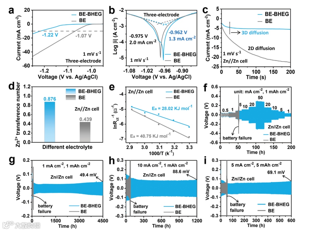 图3. (a) 三电极体系中的LSV曲线, (b) Tafel曲线。(c-f) 对称Zn//Zn电池的电化学数据。(c) 计时电流(CA)曲线, (d)Zn²⁺迁移数, (e) 去溶剂活化能。 (f) 对称Zn//Zn电池的倍率性能和 (g-i) 循环性能。