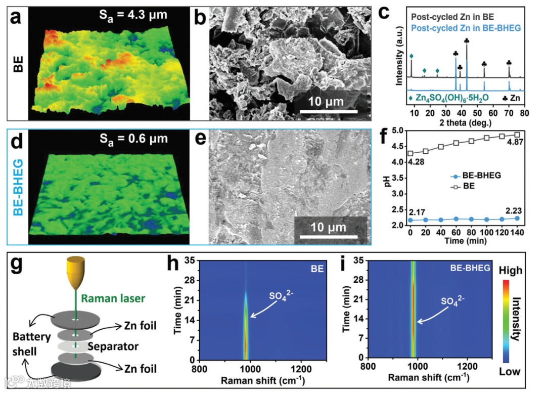 图4. 在BE和BE-BHEG中循环后Zn负极的表征:(a,d) 激光共聚焦显微镜(LSCM)图像, (b,e) SEM图像, 和 (c) XRD图谱。(f) 对称Zn//Zn电池循环过程中,水系电解液pH的变化。(g) 集成拉曼光谱装置的对称Zn//Zn电池示意图,(h, i) Zn沉积过程中锌界面SO₄²⁻阴离子在BE和BE-BHEG中的拉曼强度变化图。