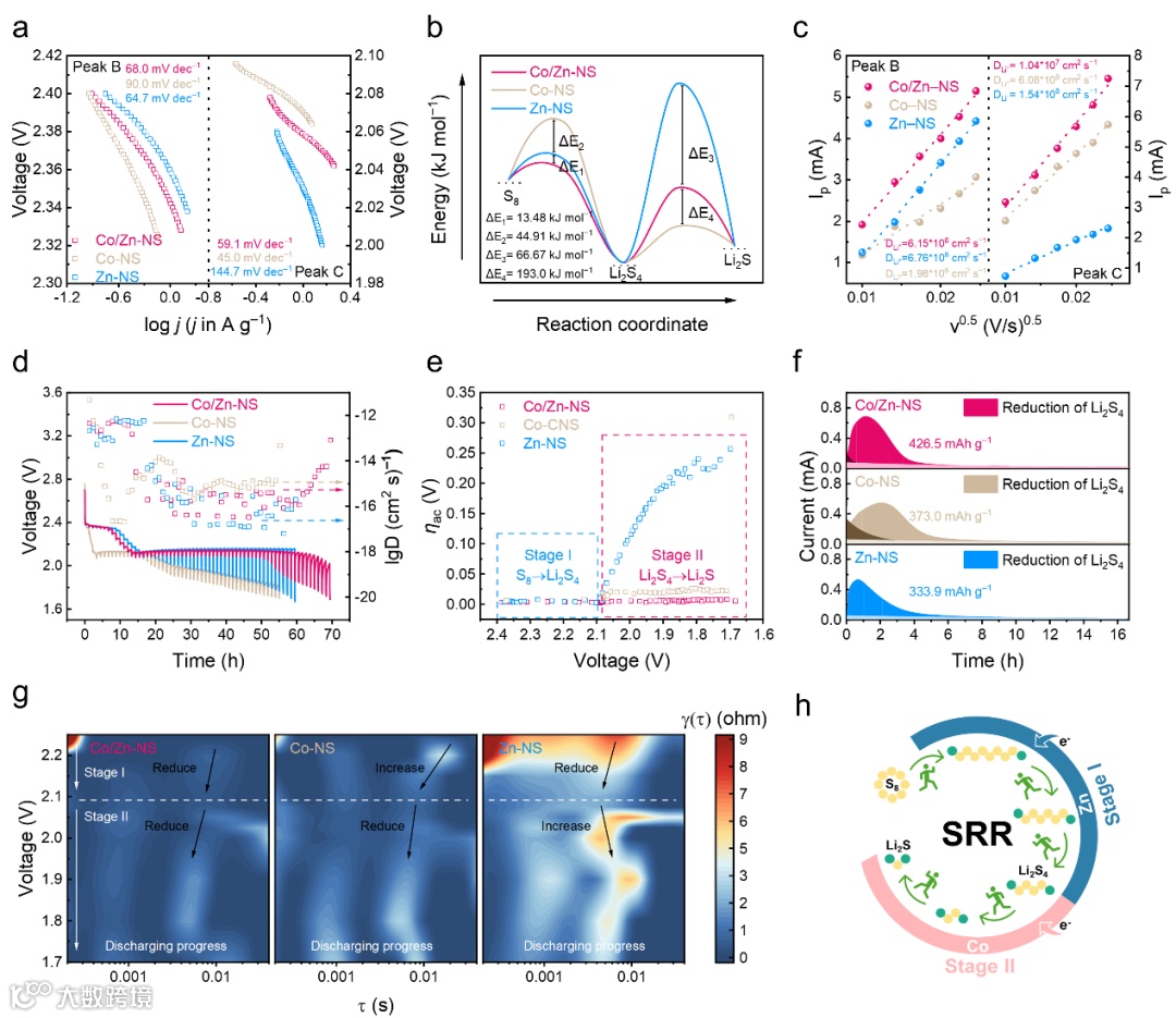 进一步研究了双位点串联催化剂对多硫化物转化动力学影响,分别计算各样品的Tafel斜率,相对活化能,锂离子扩散系数,反应过电势以及反应过程中的电荷转移电阻,结果表明在第一阶段(S8→Li2S4),含有Zn位点的样品反应速率更快,过电势更小,电荷转移阻力更低;在第二阶段(Li2S4→Li2S),含有Co位点的反应速率更快,过电势更小,电荷转移阻力更低。总之,该工作描述了一种串联催化转换策略,基于精心设计的修饰了高分散钴颗粒的锌基碳纳米片阵列催化剂,双位点协同加速多硫化物的转化。Zn位点作为长链多硫化物的电催化剂,促进S8转化为Li2S4,而Co位点增强了Li2S4随后还原的动力学。这种串联催化不仅加速了初始反应物的转化,而且还为后续反应积蓄更多的中间体反应物,以达到最大化容量。