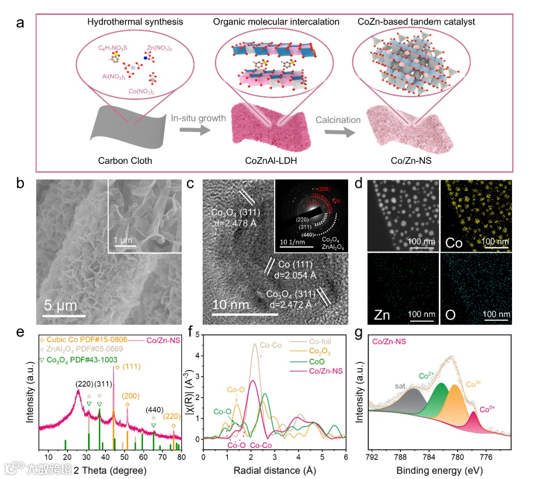 在碳布基底上合成了有机分子插层的 CoZnAl 层状氢氧化物 (LDH) 阵列。随后,CoZnAl-LDH通过高温热解转化为带有钴颗粒的锌基碳纳米片阵列(Co/Zn─NS)。扫描电子显微镜(SEM)和透射电子显微镜(TEM)图像(图1b,c)表明热解后形成了直径为2 μm、厚度为40 nm的稳定有序的碳纳米片阵列。此外,许多核壳状纳米颗粒(约10 nm)均匀分布在纳米片阵列上。纳米颗粒的高分辨率透射电子显微镜图像中观测到的晶面间距为0.205和0.247 nm(图 1c),对应核中金属Co的(111)晶面和壳中Co3O4的(311)晶面。选区电子衍射图(图1c)显示了与Co(111)、Co(200)、Co3O4(220)、Co3O4(311)、ZnAl2O4(220)、ZnAl2O4(311)和ZnAl2O4(440)相对应的衍射环(图c)。Co/Zn-NS相应的能量色散X射线图(图1d)表明Co元素集中在纳米颗粒上,而Zn和O均匀分布在整个纳米片上,证明在Zn基氧化物碳纳米片上修饰了高度分散的Co颗粒。Co/Zn─NS的组成和结构通过X射线衍射图进一步探究,各衍射峰归属于立方Co相(PDF#15-0806)、Co3O4(PDF#431003)和ZnAl2O4(PDF#05-0669)尖晶石相,表明金属Co、Co3O4和ZnAl2O4共存在纳米片阵列内(图1e)。为了进一步揭示Co/Zn─NS电子结构的价态,测量了X射线吸收近边结构(XANES)光谱和扩展X射线吸收精细结构(EXAFS)光谱(图1f)。