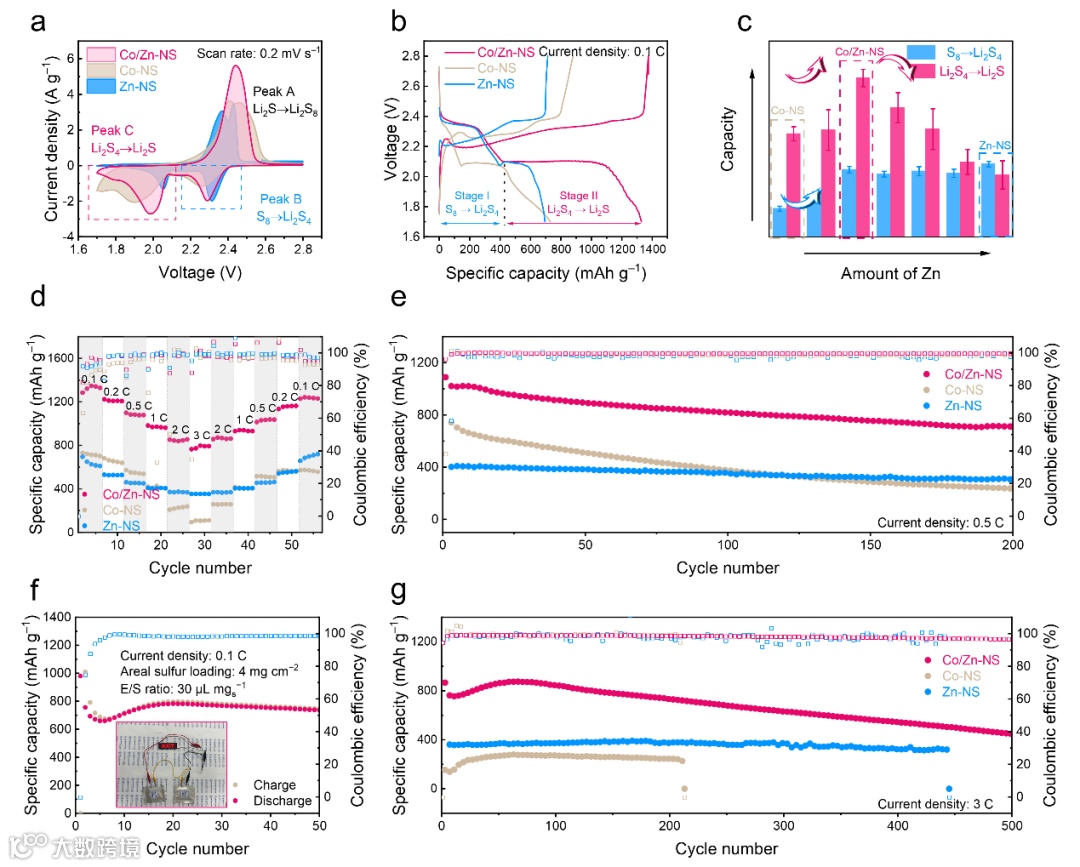 为了研究Co/Zn─NS在锂硫电池中的电化学性能,以Co/Zn─NS@S复合材料作为正极、锂箔作为负极组装了纽扣电池。在1.7-2.8 V的电压窗口内,以0.2 mV s−1的扫速进行循环伏安测试(图 2a)。在2.40 V/2.10 V和2.30 V处观察到两个明显的还原峰和一个氧化峰,分别对应于S8→Li2S4、Li2S4→Li2S和Li2S→Li2Sx。与Co─NS和Zn─NS相比,Co/Zn-NS表现出更高的峰值电流和更小的极化,表明有利于多硫化物的快速转化。进一步计算长链和短链多硫化物的转化容量。Co/Zn─NS和Zn─NS在第一个还原峰处的CV曲线积分面积大于Co─NS,即Zn位点的存在促进了S8向Li2S4的转化。对于第二个还原峰,含Co样品(即Co─NS和Co/Zn─NS)的积分面积高于纯Zn─NS的积分面积,表明Co位点能促进短链多硫化物的转化。相似的结论亦可以通过比较两个转化阶段的恒电流曲线容量得到。得益于双位点的串联催化作用,Co/Zn-NS展现出优异的倍率性能和长循环稳定性,并且由于阵列结构上富含过渡金属化合物,Co/Zn-NS也可作为锂负极载体,诱导锂均匀沉积和剥离,构造双功能双位点的锂硫全电池。
