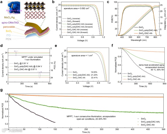 图5. 光伏性能和环境稳定性。(a)f-PSCs的器件结构,(b)J-V曲线,(c)IPCE,(d)稳态效率,(e)J-V曲线,(f)湿热稳定性和(g)MPPT测试